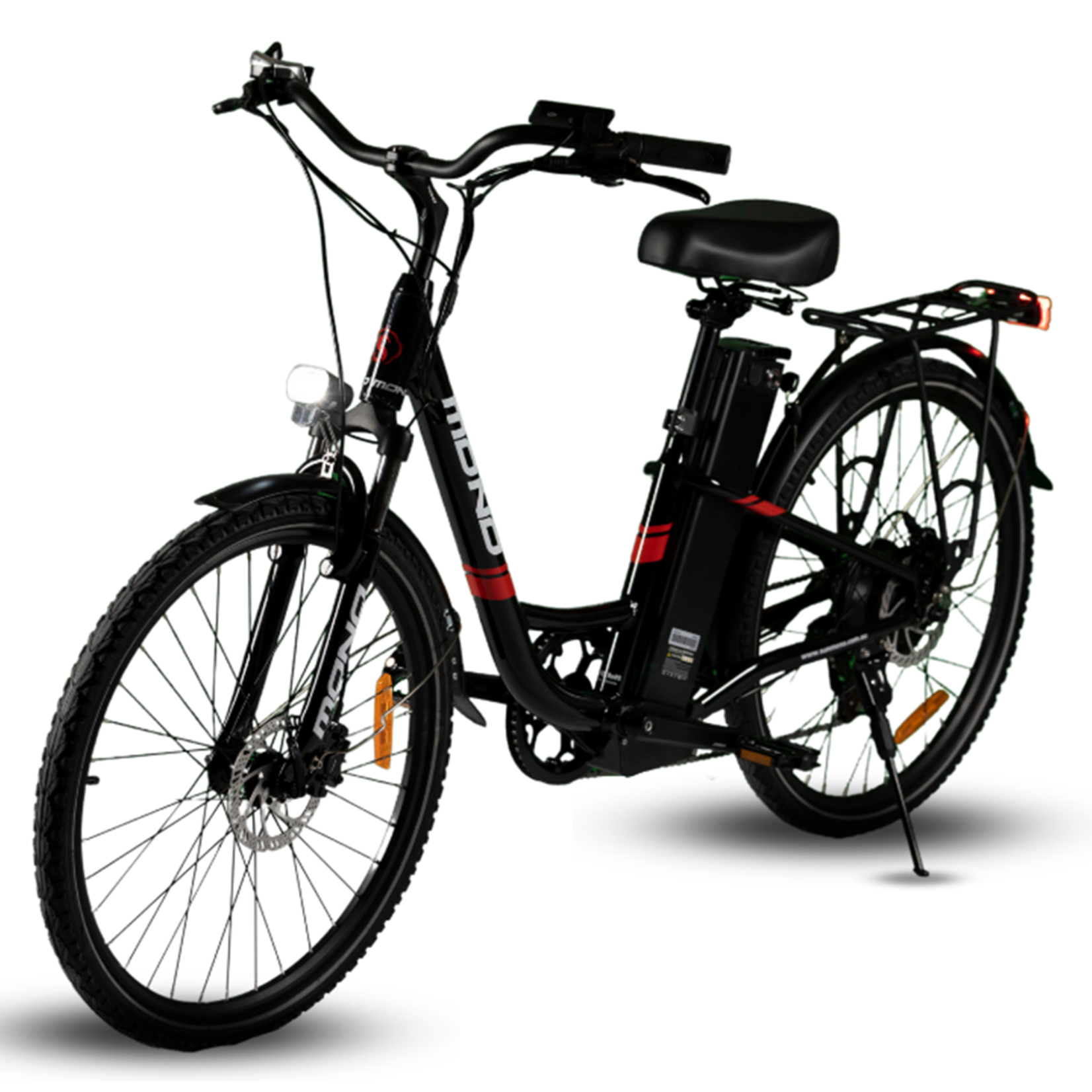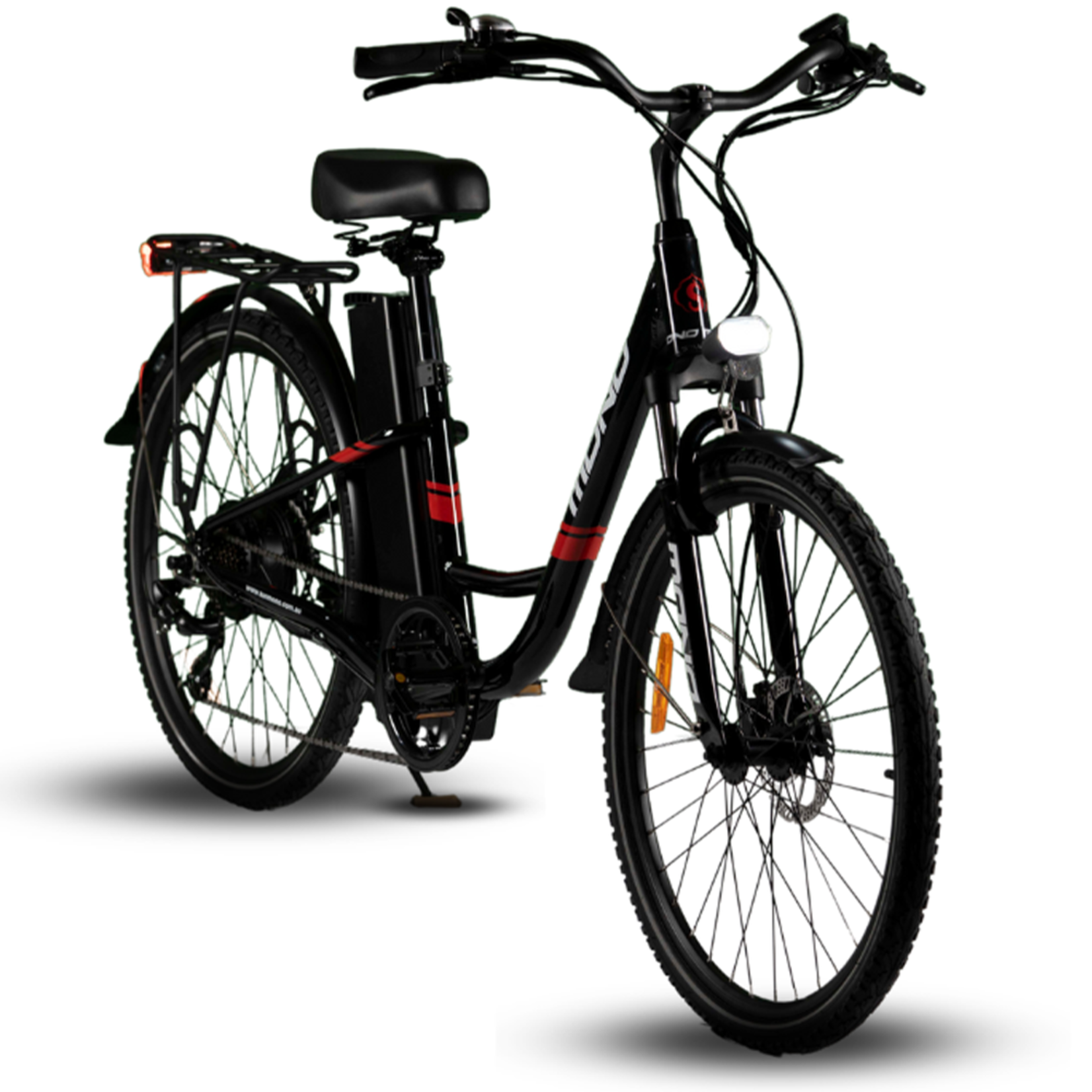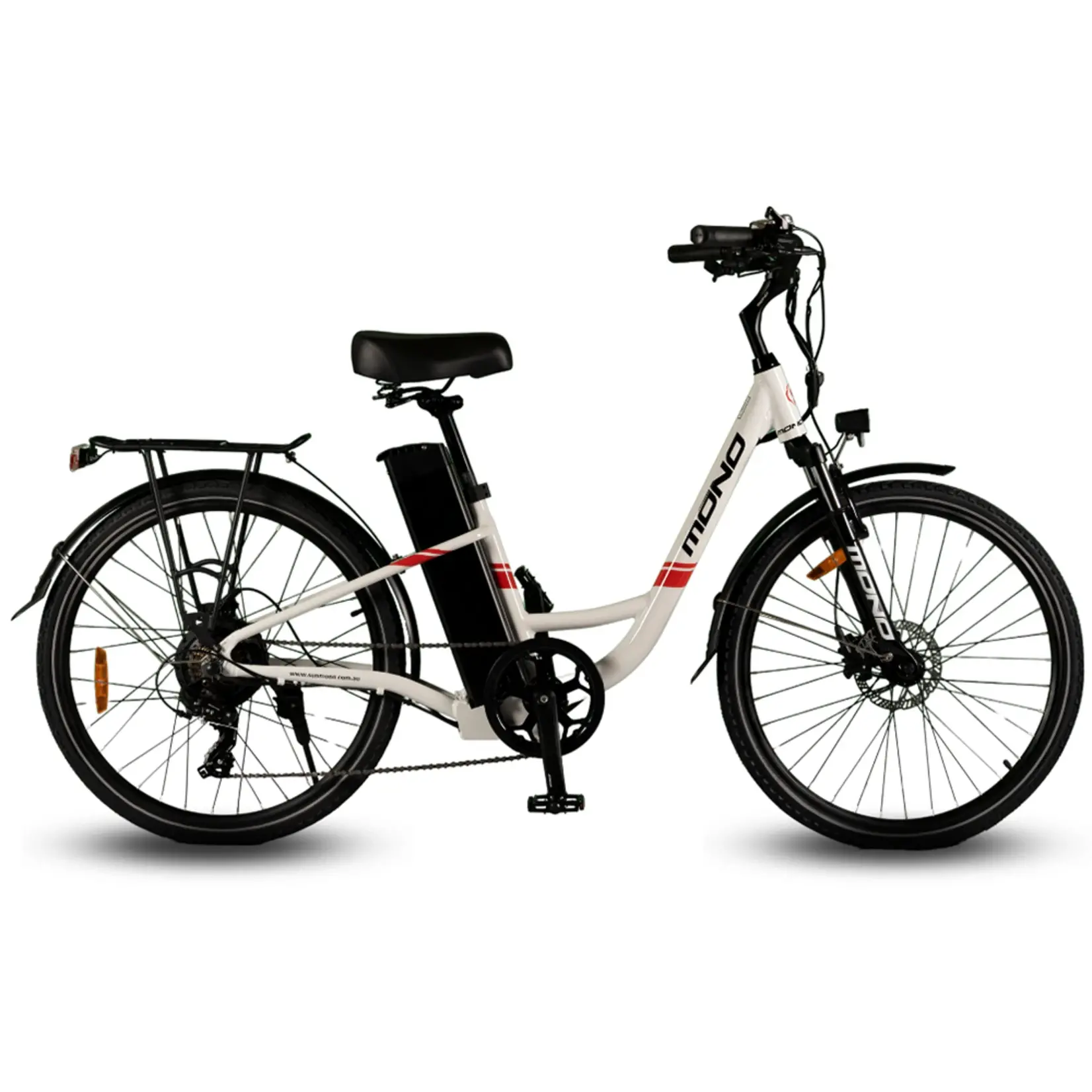 This electric urban bike provides integrated cargo carry capacity and a powerful motor at a very cost-effective price. The bike’s core is the lightweight step-through frame making it suitable for both male and female riders. At the same time, the adjustable leather seat, 26″ wheels and 40mm front suspension make it comfortable to ride.