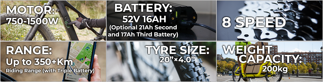 • Motor: Mid Drive: 52V1000W Truckrun Mid Drive Motor with 220N.m Torque, AWD: 52V1500W Dual 750W Motor with 184N.m Torque, Rear Drive: 52V750W Rear Motor with 92N.m Torque