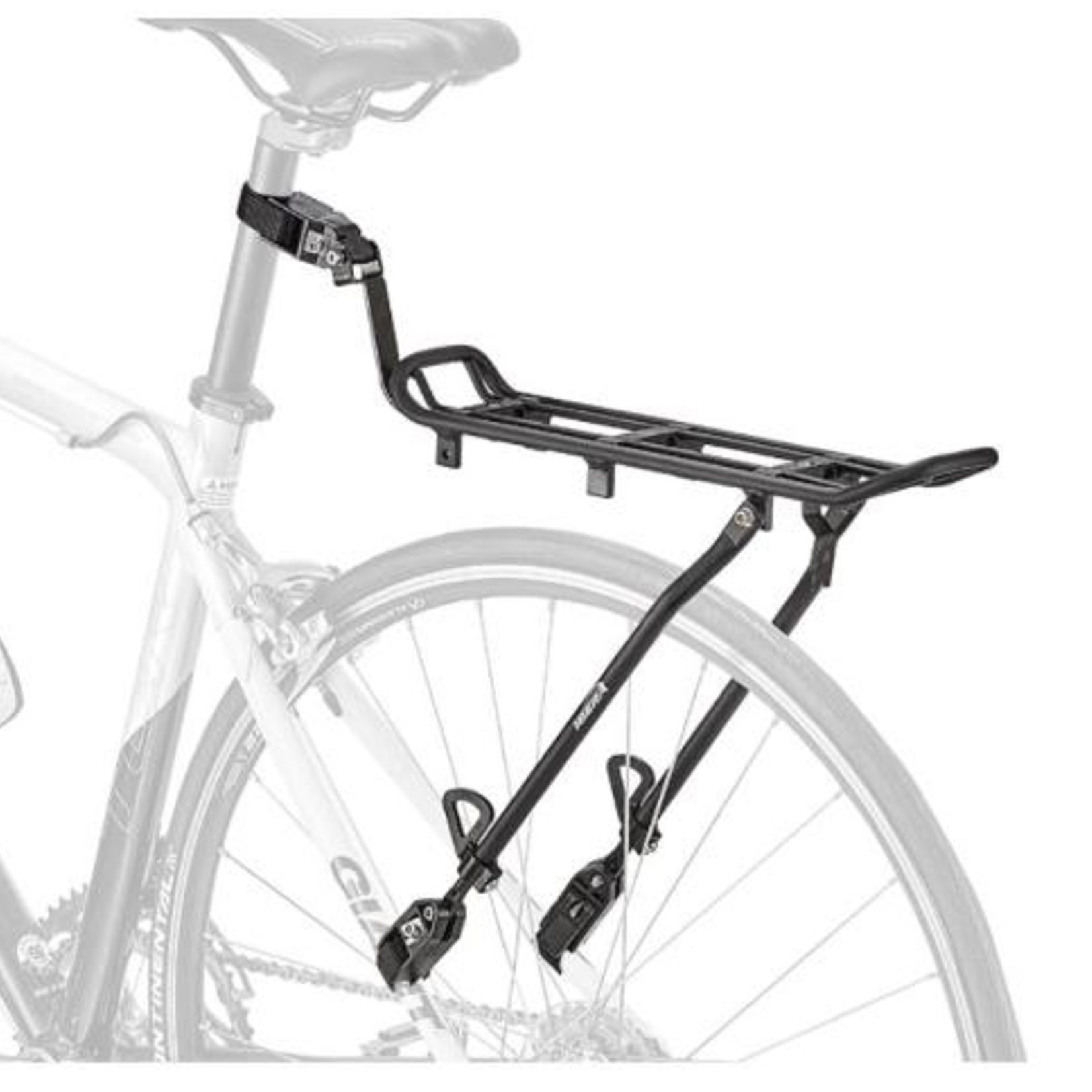 Clamp-on rack for road bikes or other bikes without mounting holes. Frame-seatpost mounted for light, top loads.