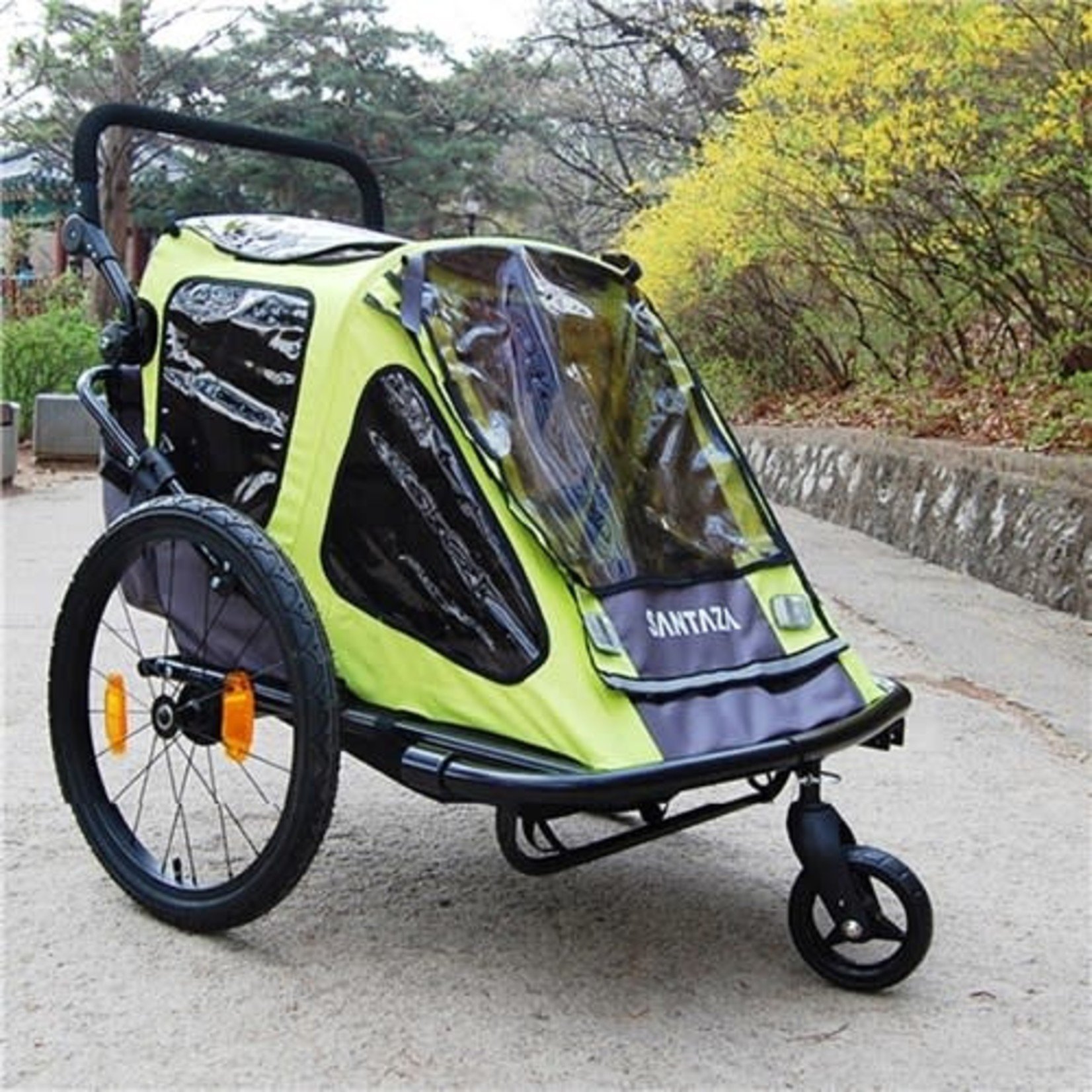 For 1 or 2 children. Alloy frame. Capacity: 40kg. 20″ Rear wheels. 6″ Front swivel wheel. Reflectors included. Safety flag included.