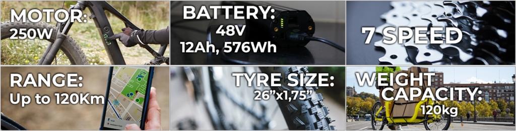 Motor Power (W): 250 Battery: 14A, 48V, 672Wh Max Range (KM): Up to 90Km Hydraulic Disk Brakes